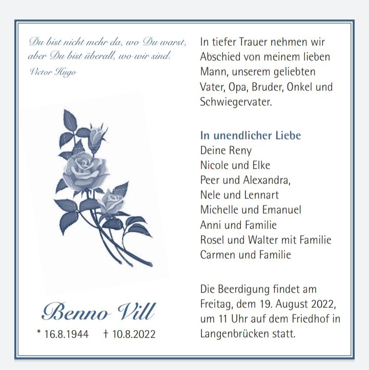 Ich bin dankbar für all die Erinnerungen, die mir an ihn bleiben. Ich bin dankbar, dass er in ihnen, in unseren Herzen aber auch in uns weiterlebt. Dass ich ihn sehe, wenn ich in die Augen meiner Tante Nicole schaue. Ich sehe ihn in ihrer Kreativität. Ich sehe ihn in meinem Papa, der genauso wie Opa nie unordentlich gekleidet das Haus verlassen würde. Ich höre ihn in seiner musikalischen Begabung. Ich spüre ihn durch meine Oma, deren tiefe Trauer ihre nie endende Liebe zu ihm widerspiegelt.